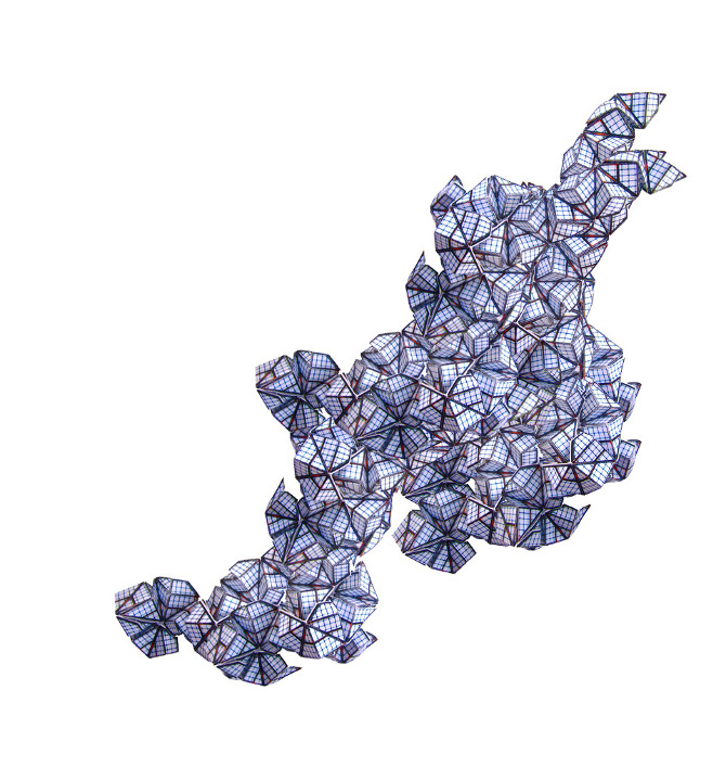 Here a similar shape has been created and repeated but this time it is made of fabric, this shows that these things don't nessecerily have to be made of paper and you can still produce the same effect. With this piece I also like how the stripes and colours are arranged although I'm not quite sure why, I can't pin-point it but it could be something to consider when making a background or theme colour when working with shapes with multiple sides as it shows it can still look good without it naturally flowing into the next face of a shape.